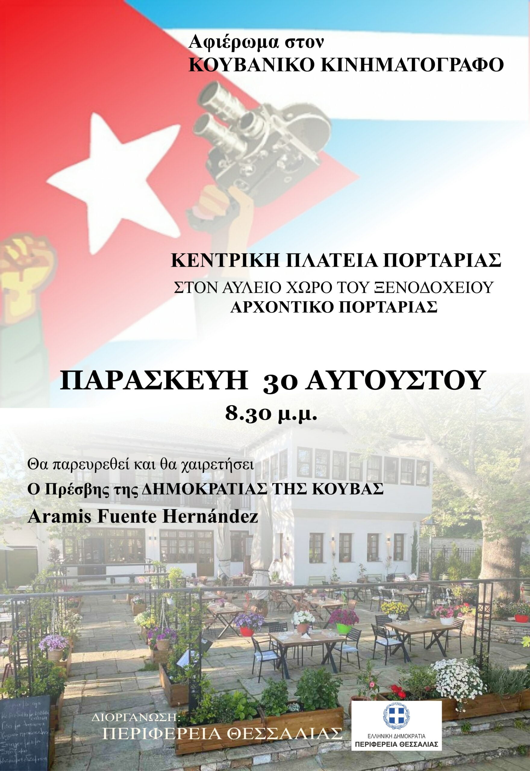Η Περιφέρεια Θεσσαλίας, στο πλαίσιο της επίσκεψης στη Θεσσαλία του πρέσβη της Δημοκρατίας της Κούβας στην Ελλάδα κ. Aramis Fuente Hernandez, κατόπιν της επίσκεψης που του απηύθυνε ο Περιφερειάρχης Θεσσαλίας Δημήτρης Κουρέτας, διοργανώνει αφιέρωμα στον Κουβανικό κινηματογράφο, με την προβολή της ταινίας CUBA LIBRE, την Παρασκευή 30 Αυγούστου στις 8.30μμ στην κεντρική πλατεία Πορταριάς, στον αύλειο χώρο του ξενοδοχείου «Αρχοντικό» ΠΟΡΤΑΡΙΑΣ.